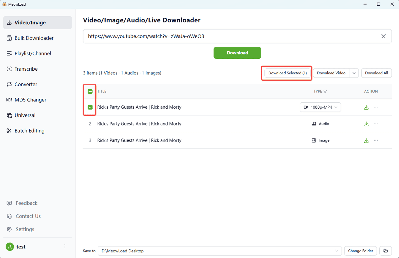 動画アイテムにチェックを入れ、「選択したものをダウンロード」をクリックします。MeowLoadは、デフォルトで動画ファイルを MP4 形式でダウンロードします。