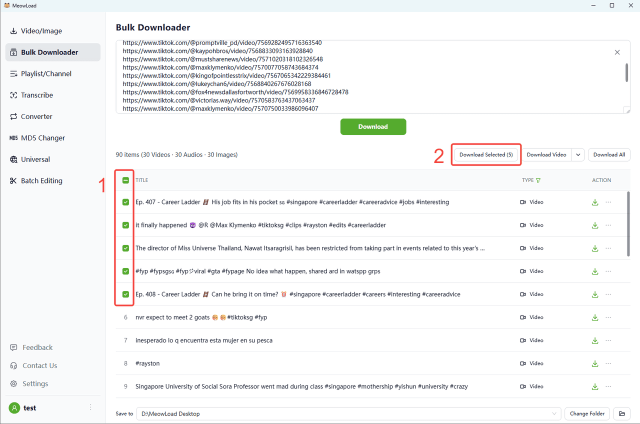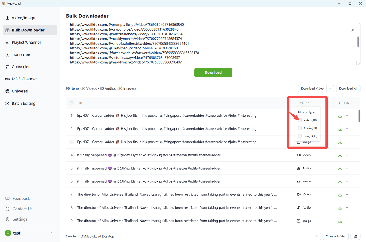 「一括ダウンローダー」を選択し、TikTok リンクを貼り付け(1行に1つ、一度に最大30リンク)、ダウンロードボタンをクリックします。